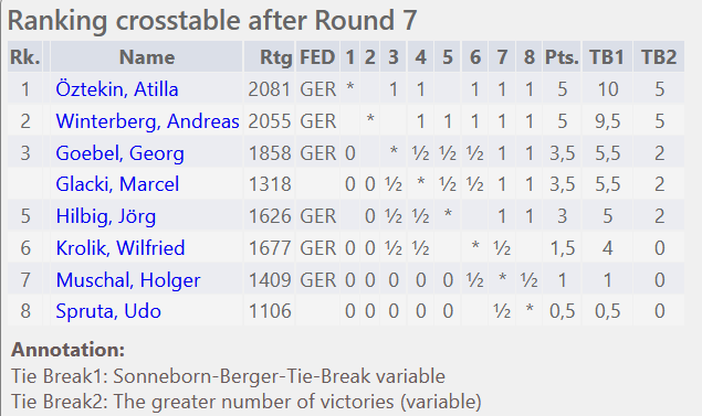 An der Tabellenspitze hat sich ein spannendes Duell entwickelt: Atilla Öztekin und Andreas Winterberg führen das Feld mit jeweils 5 Punkten an. Lediglich die Feinwertung trennt die beiden aktuell voneinander. Brisant: Das direkte Aufeinandertreffen der beiden Spitzenreiter steht noch aus und dürfte eine Vorentscheidung im Kampf um den Titel bringen.