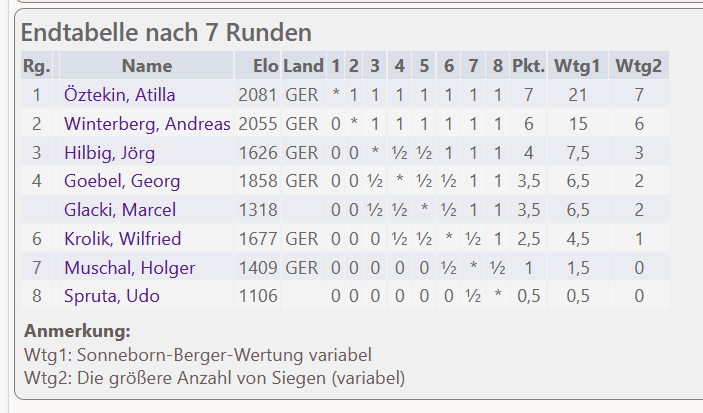 Mit diesem Sieg zog Jörg noch an Georg Goebel und Marcel Glacki, der ein sehr starkes Turnier spielte, vorbei. Wilfried Krolik blieb dagegen bei 2,5 Punkten stehen und belegte Platz sechs.